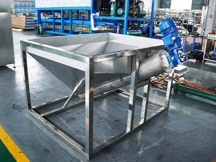 Dispositivo de transporte de parafuso e armazenamento de gelo: selecione a capacidade apropriada para armazenar o gelo antes de embalar de acordo com a noite sem vigilância e alimentá -lo automaticamente no dispositivo de elevação e ao empacotador ao embalar